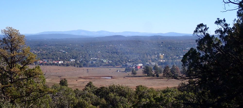 The climbing up and down hills soon had Cinnamon huffing and puffing, but she kept a steady walk. To the south, there were columns of smoke from some controlled fires that appeared to be on private property. I could see the fire lookout tower on Juniper Ridge on the other side of Highway 260. Behind us, I could see Show Low in the foreground with the White Mountains on the eastern horizon. There was snow visible on the highest peaks. As the trail curved around to the north, I could see the windmills between Snowflake and Holbrook.