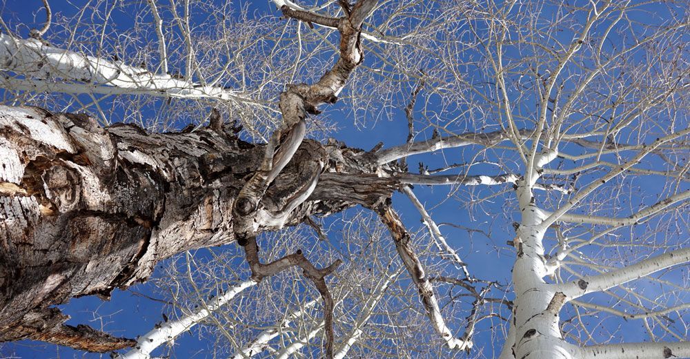 What do we see when we look up? In the White Mountains, we are surrounded by towering giants. We smaller creatures scurry between them. From our perspective, we observe only their legs — robust and steady — appearing still in contrast to the rapid pace of our lives. If we examine the lines on their trunks — like wrinkles formed over a lifespan much longer than our own — we can trace them up to the youngest branches. These extremities are flexible and animated, waving gently in the wind. The scene is a turquoise sky of dwindling branches reaching into the vivid blue expanse.