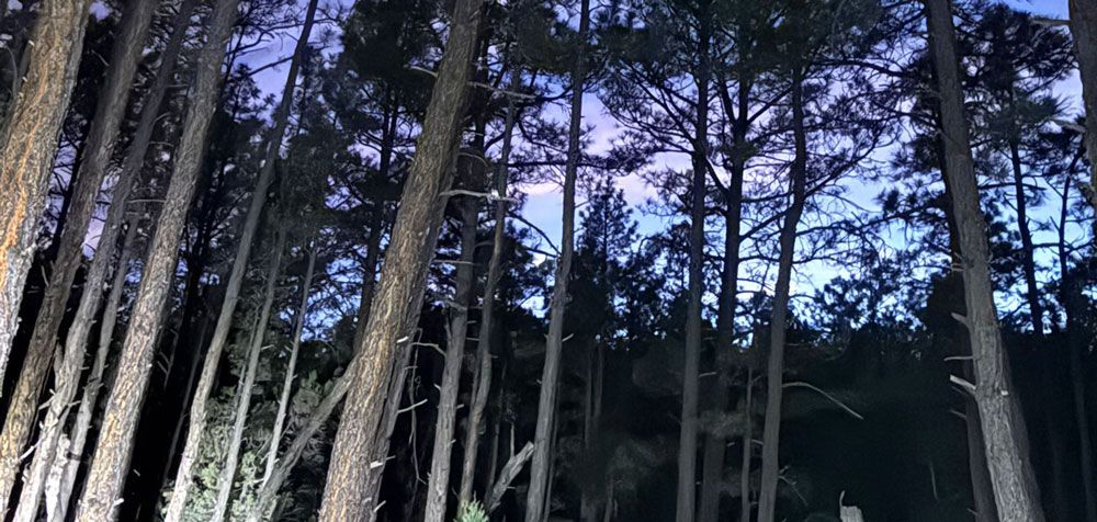 Lighting: I have small bike lights strapped to my hiking sticks to provide about an eight-foot circle of light around me, which feels like a safe light bubble to travel in. I have two lights on the sticks and a spare flashlight in my hip pack plus the phone light if all other light sources go out. Headlamps also work well to light your way, but be sure you have a backup source of light. As silly as it might sound, my dogs wear lighted collars, which both keeps them visible to me and gives them some increased trail visibility of their own.